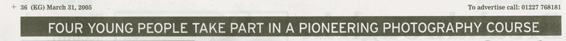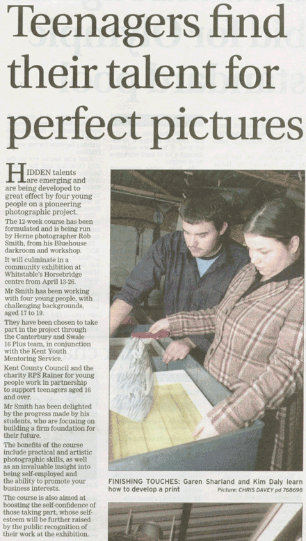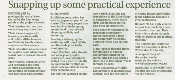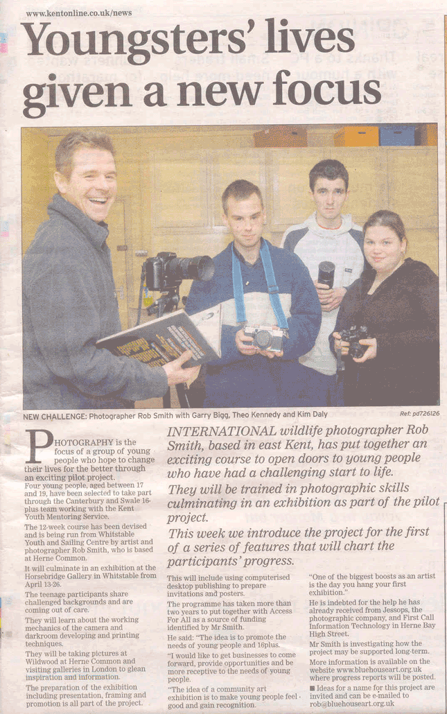 These projects have led to a variety of articles featuring Bluehouse and the young persons involved in these programmes, to be printed in the local and regional Kentish Gazette in 2005.